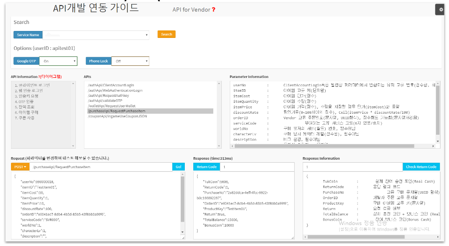 상대 개발사에도 전달하기위한 api 테스트 사이트를 제공하기도 했습니다.