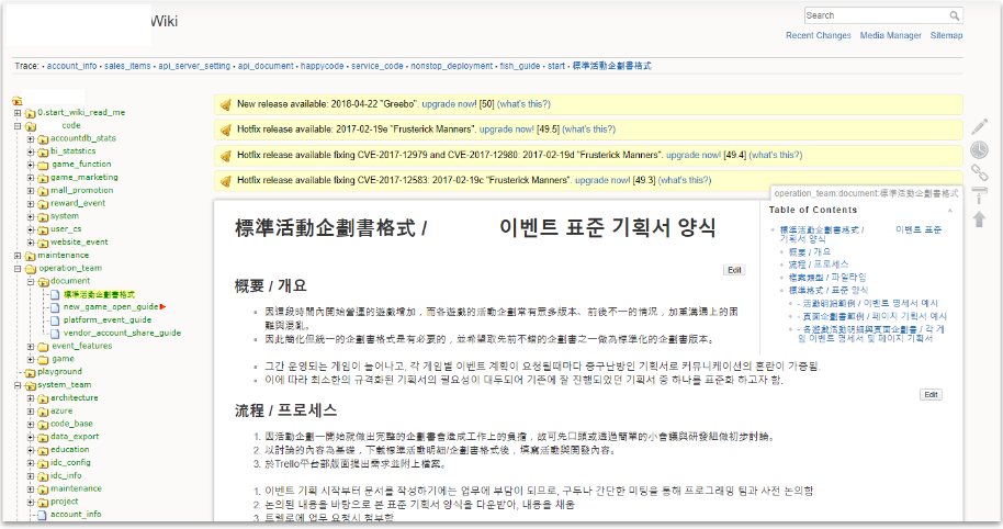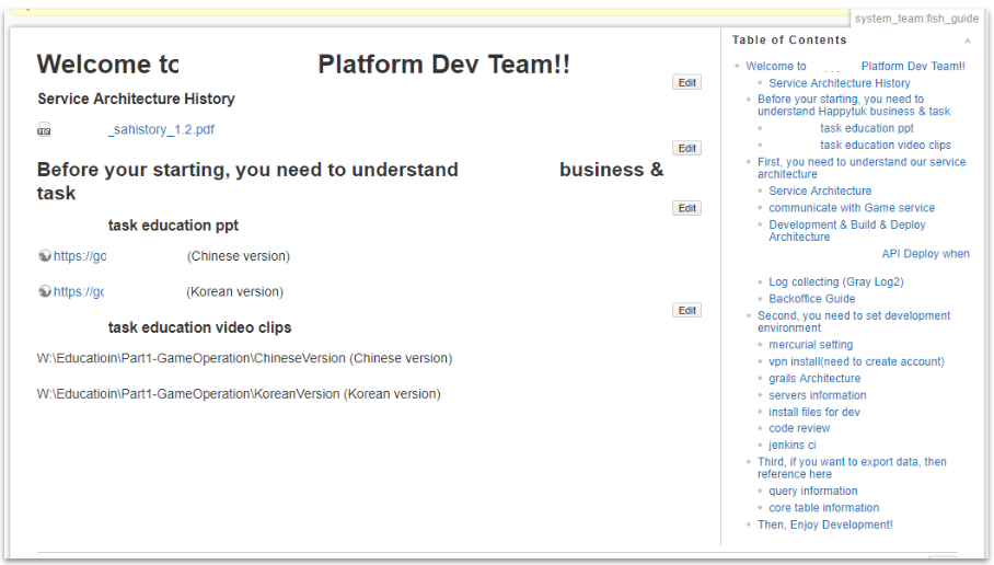 큰회사라면 당연하지만 회사의 체계가 제대로 잡히지 않거나 소규모의 회사일수록 변화가 많아 누군가 원하는사람이 시작을 해야할 경우도 있겠죠. 저의 경우에도 목마른 사람은 개발팀이었고 위키 서버를 운영했습니다.